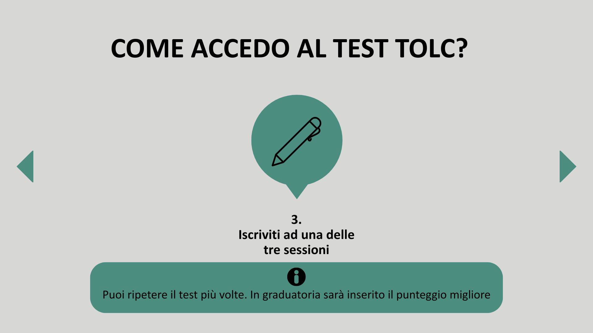 Ripetizione: è possibile ripetere il TOLC, ma non più di una volta al mese per ogni tipologia di test.